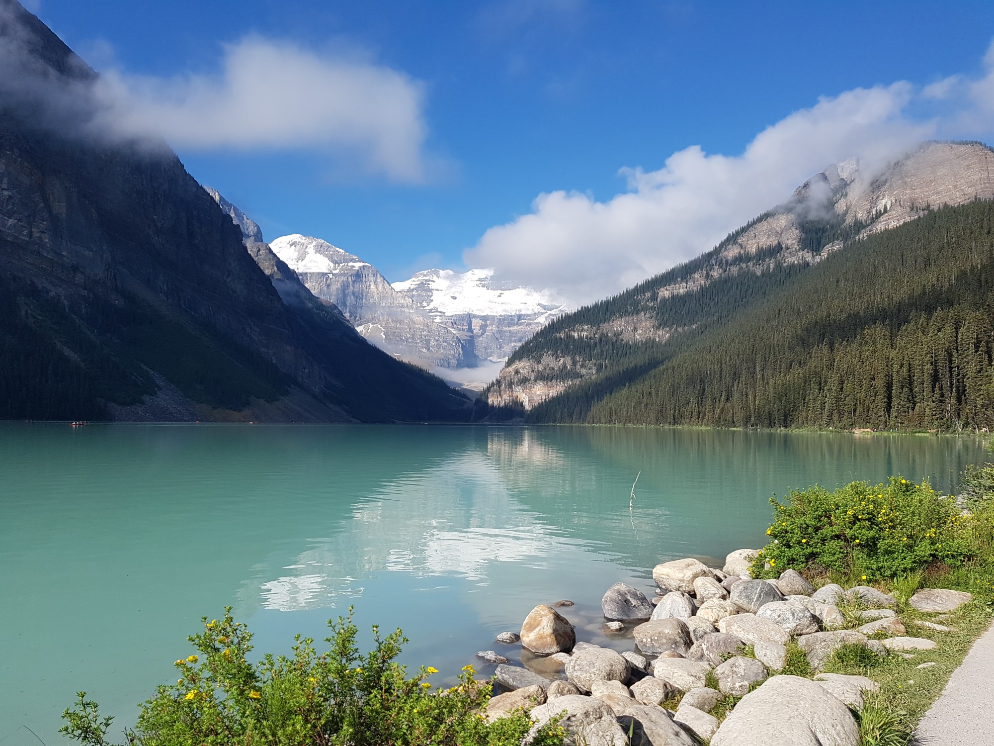 Wanderfreunde aufgepasst: Die Trails um den Lake Louis sind ein Wandertraum! Es gibt jedoch einen Haken. Hier wandert ihr definitiv nicht alleine. Also am besten früh raus aus den Federn, einen Parkplatz ergattern und dann ab ins Wanderparadies. Das Wegenetz ist vielfältig und sehr gut ausgeschildert. Wir haben uns vorher nicht wirklich eine Route überlegt, sondern sind einfach drauf los gewandert. Unser erstes Ziel war dann die Plain of the Six Glaciers mit herrlichem Blick auf die Gletscherzunge und den Gletscher. Im Geröll sitzend genießen wir in der warmen Sonne das eisige Panorama, hören dem Gletscher beim Knacken zu und sehen sogar eine Lawine abgehen. Das ganze natürlich aus sicherer Entfernung.