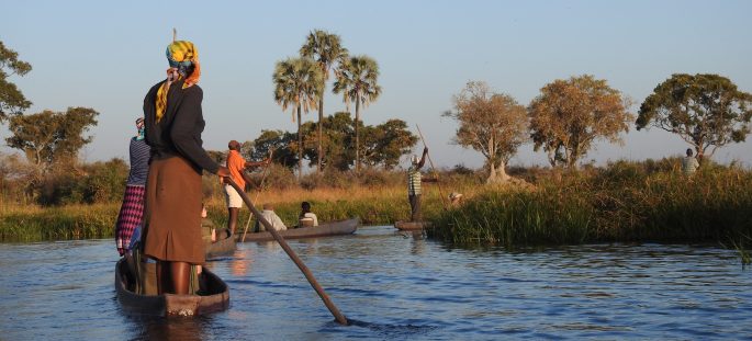 Während unserer Mokorofahrt zu unserem Camp auf einer der der vielen Inseln im Delta genießen wir die Ruhe und Einsamkeit auf dem Wasser und lauschen dem Grunzen der Hippos.