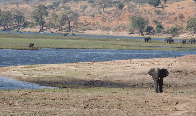 Auf dem Rückweg ins Camp kreuzt eine riesige Elefantenherde unseren Weg. Sie ist auf dem Weg zum Wasser. Im Schlepptau ist auch ein ausgewachsener Bulle – den wir ein paar Stunden später wiedersehen…und zwar direkt in unserem Camp, das er neugierig durchstreift.